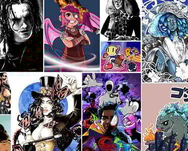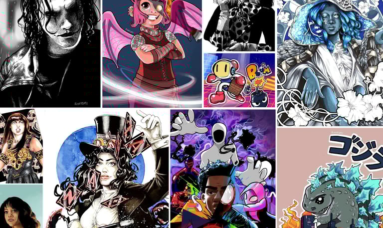 Amo celebrare i miei personaggi e prodotti preferiti, che siano film, fumetti, libri, o videogiochi. Qui troverete alcuni esempi fatti sia usando la tecnica digitale che varie tecniche tradizionali (acquerello, markers, inchiostri, gouache, e matite). Un esempio è il progetto #musicweek, dove celebro i grandi artisti musicali del passato e del presente. Oltre a questo potrete trovare studi di anatomia e figura umana, paesaggi, animali, e illustrazioni originali di cibi!
